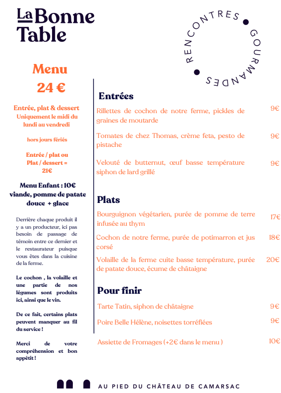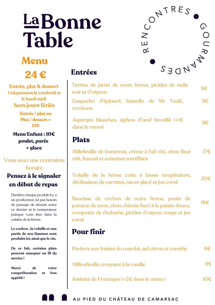 La carte du Restaurant change tous les mois environ, rendez-vous au pied du Château de Camarsac pour découvrir notre cuisine et nos saveurs locales !